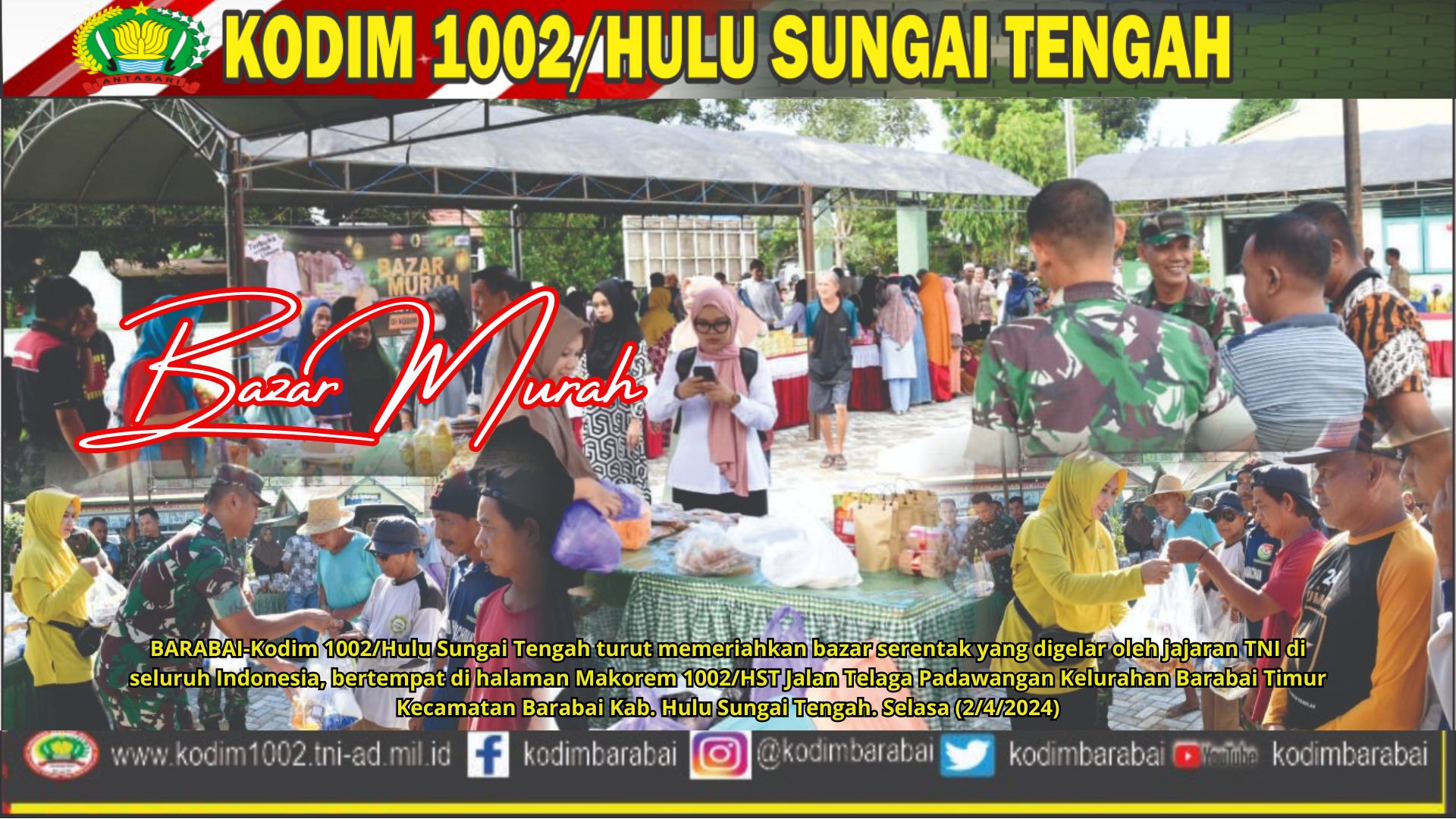 Bazar Murah Menyambut Hari Raya Idul Fitri 1445 H/2024 M ini merupakan salah satu wujud nyata dukungan TNI terhadap pemulihan ekonomi nasional, dengan harapan dapat memberikan dampak positif bagi pertumbuhan ekonomi khususnya di wilayah Hulu Sungai Tengah.