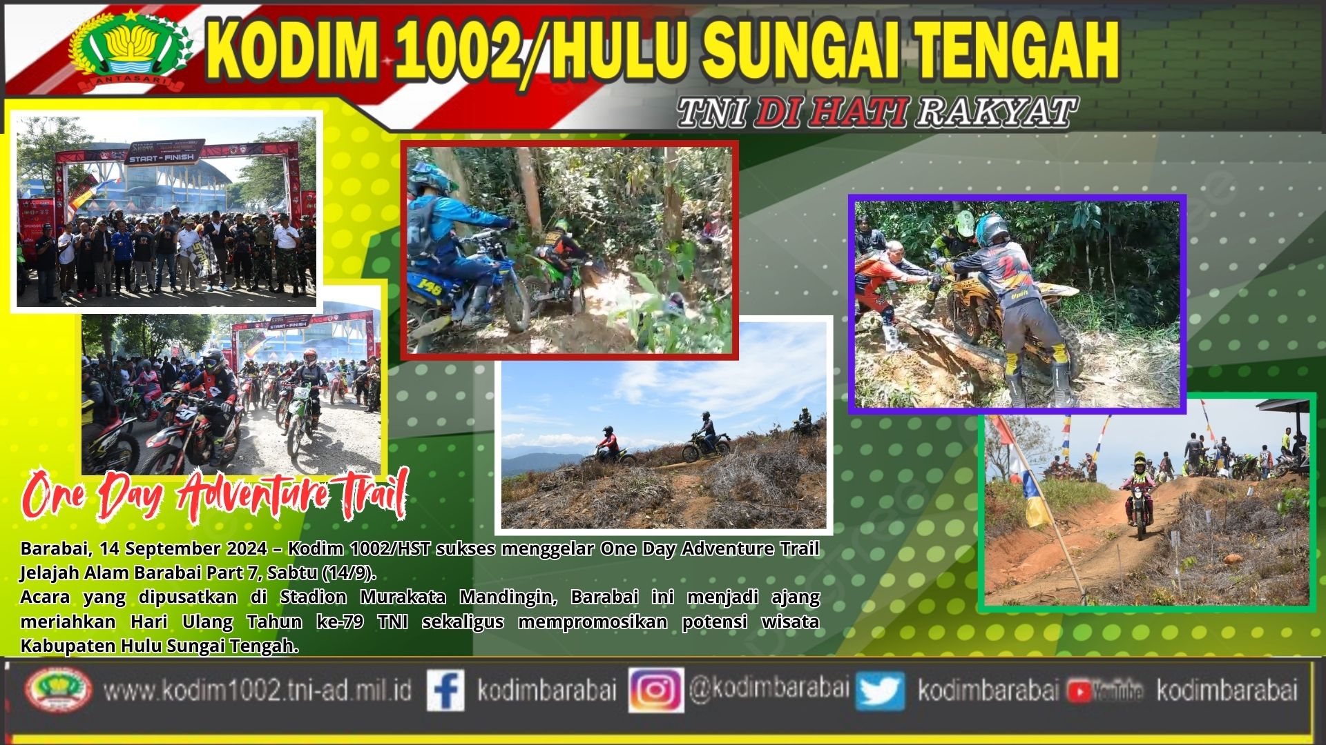 “Kegiatan ini bukan hanya sekadar ajang trail adventure, tetapi juga momen untuk mempererat sinergi TNI dengan masyarakat serta mempromosikan potensi wisata daerah,” ungkap Letkol Inf Fery Perbawa, Dandim 1002/HST.