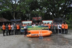 Kegiatan selain penyampaian materi oleh Kalak BPBD Kab.HST H.Budi Hariyanto dilanjutkan dengan praktek lapangan simulasi tanggap bencana alam banjir.(pendim1002).