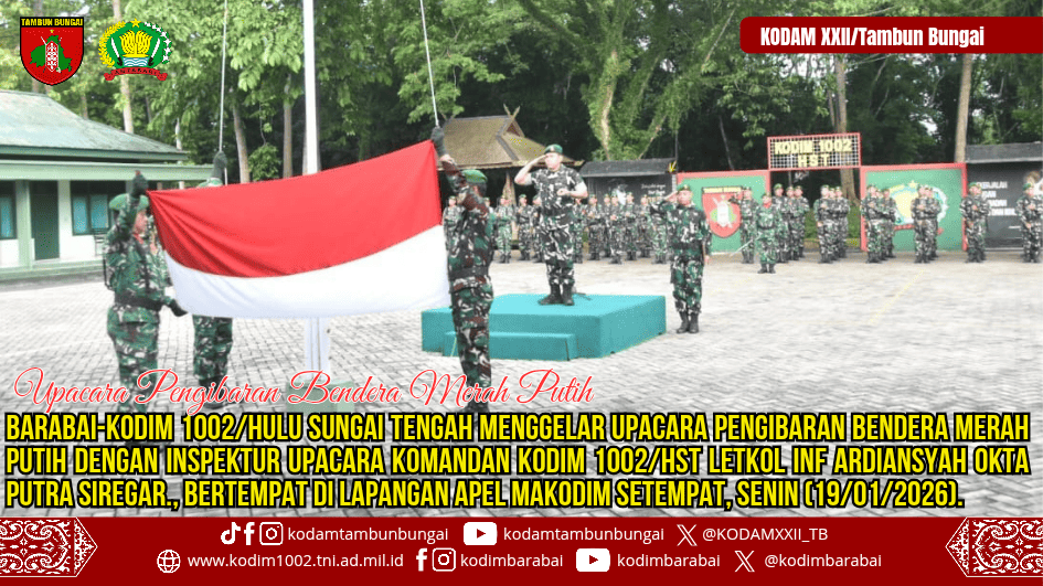 BARABAI – Kodim 1002/Hulu Sungai Tengah (HST) menggelar Upacara Pengibaran Bendera Merah Putih yang berlangsung khidmat di Lapangan Apel Makodim 1002/HST, Senin (19/01/2026).
