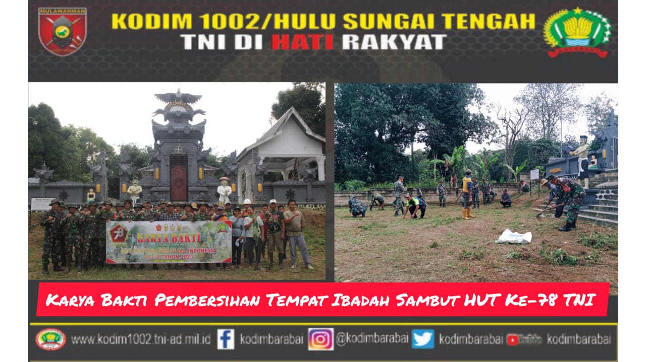 BARABAI-Kodim 1002/Hulu Sungai Tengah menggelar karya bakti pembersihan tempat ibadah dalam rangka menyambut HUT Ke-78 TNI tahun 2023.