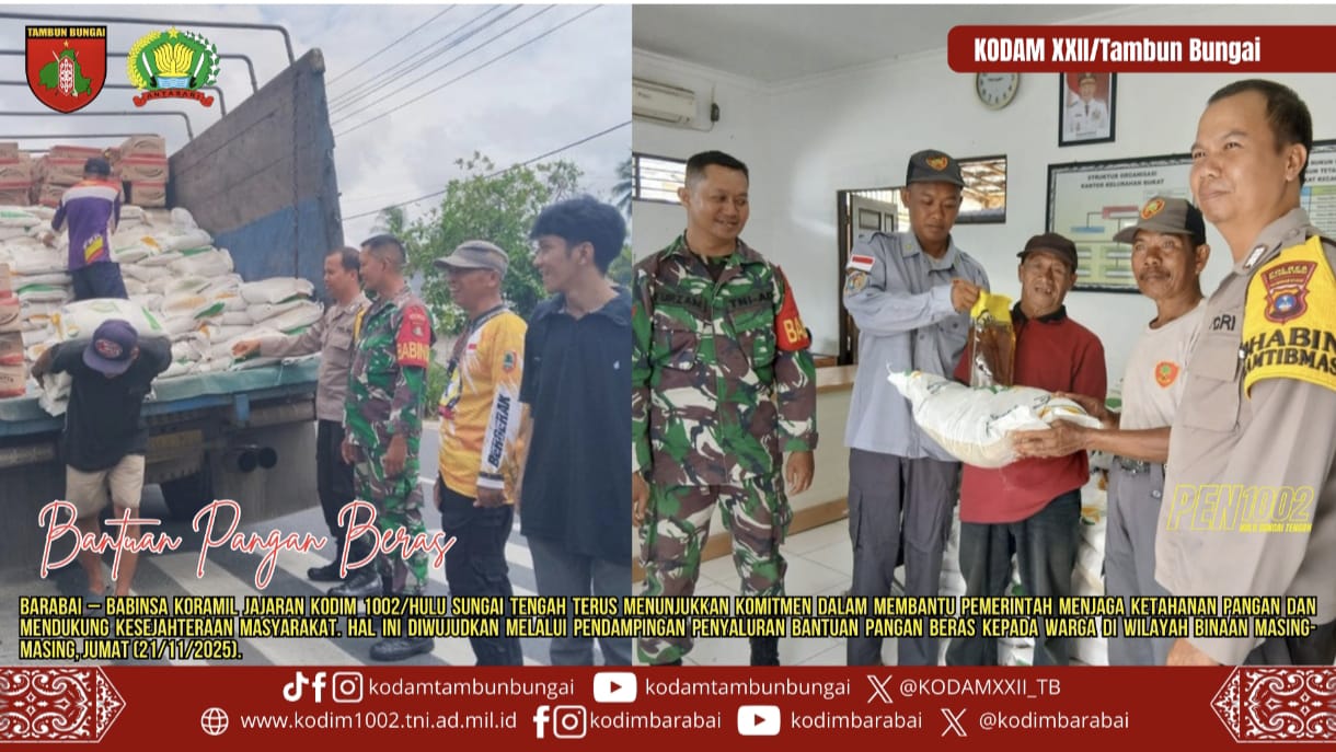 BARABAI – Babinsa Koramil jajaran Kodim 1002/Hulu Sungai Tengah terus menunjukkan komitmen dalam membantu pemerintah menjaga ketahanan pangan dan mendukung kesejahteraan masyarakat. Hal ini diwujudkan melalui pendampingan penyaluran bantuan pangan beras kepada warga di wilayah binaan masing-masing, Jumat (21/11/2025).