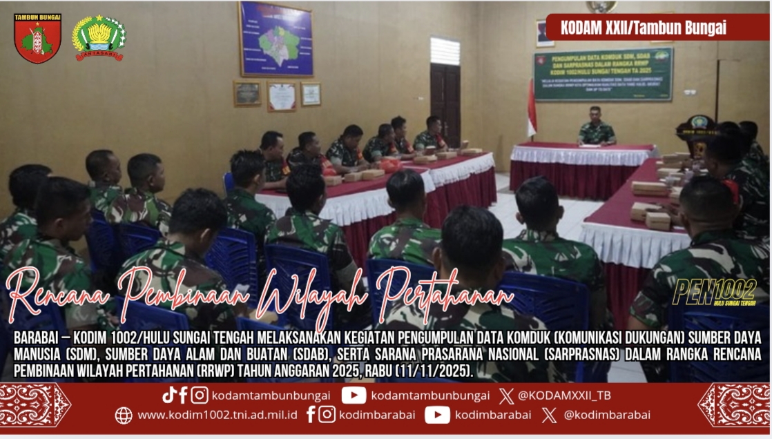 BARABAI – Kodim 1002/Hulu Sungai Tengah melaksanakan kegiatan Pengumpulan Data Komduk (Komunikasi Dukungan) Sumber Daya Manusia (SDM), Sumber Daya Alam dan Buatan (SDAB), serta Sarana Prasarana Nasional (Sarprasnas) dalam rangka Rencana Pembinaan Wilayah Pertahanan (RRWP) Tahun Anggaran 2025, Rabu (12/11/2025).