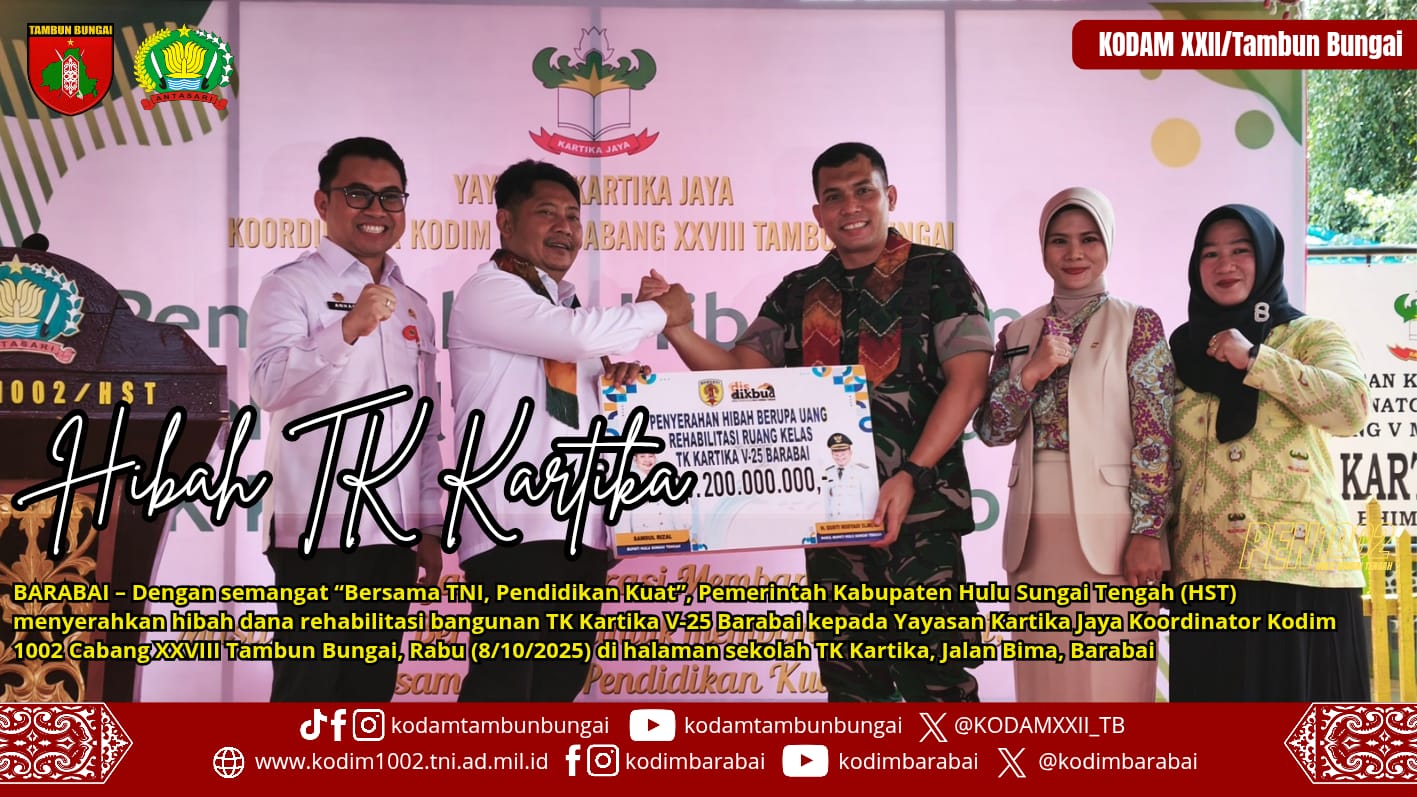BARABAI – Dengan semangat “Bersama TNI, Pendidikan Kuat”, Pemerintah Kabupaten Hulu Sungai Tengah (HST) menyerahkan hibah dana rehabilitasi bangunan TK Kartika V-25 Barabai kepada Yayasan Kartika Jaya Koordinator Kodim 1002 Cabang XXVIII Tambun Bungai, Rabu (8/10/2025) di halaman sekolah TK Kartika, Jalan Bima, Kelurahan Barabai Selatan, Kecamatan Barabai.