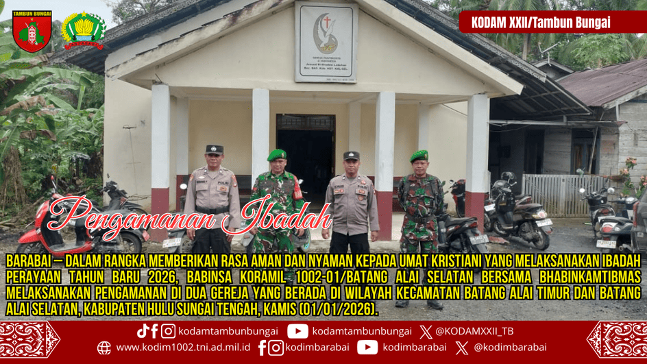 BARABAI – Dalam rangka memberikan rasa aman dan nyaman kepada umat Kristiani yang melaksanakan ibadah perayaan Tahun Baru 2026, Babinsa Koramil 1002-01/Batang Alai Selatan bersama Bhabinkamtibmas melaksanakan pengamanan di dua gereja yang berada di wilayah Kecamatan Batang Alai Timur dan Batang Alai Selatan, Kabupaten Hulu Sungai Tengah, Kamis (01/01/2026).