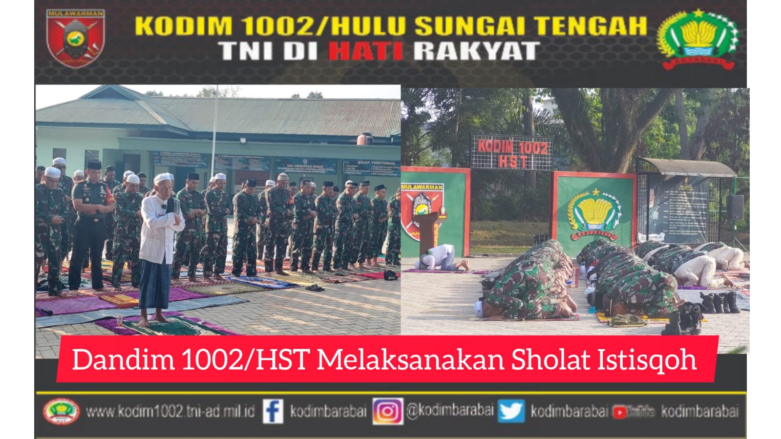 Sementara itu Dandim 1002/HST Letkol Kav Gagang Prawardhana.S.I.P.,M.Han usai melaksanakan sholat Istisqoh menyampaikan bahwa kegiatan yang baru kita lakukan ini merupakan penjabaran langsung perintah dari bapak Pangdam VI/Mulawarman Mayjen TNI Tri Budiono agar seluruh jajaran melaksanakan sholat Istisqoh,”ucapnya
