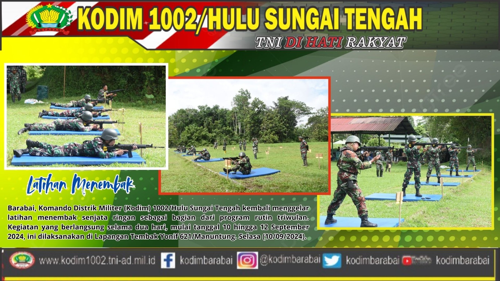 Lebih lanjut, ia menjelaskan bahwa melalui latihan ini, diharapkan seluruh prajurit dapat menguasai teknik menembak yang benar serta meningkatkan ketepatan sasaran. Hal ini sejalan dengan tujuan untuk meningkatkan profesionalisme dan kesiapsiagaan seluruh personel Kodim 1002/HST.”tegasnya.