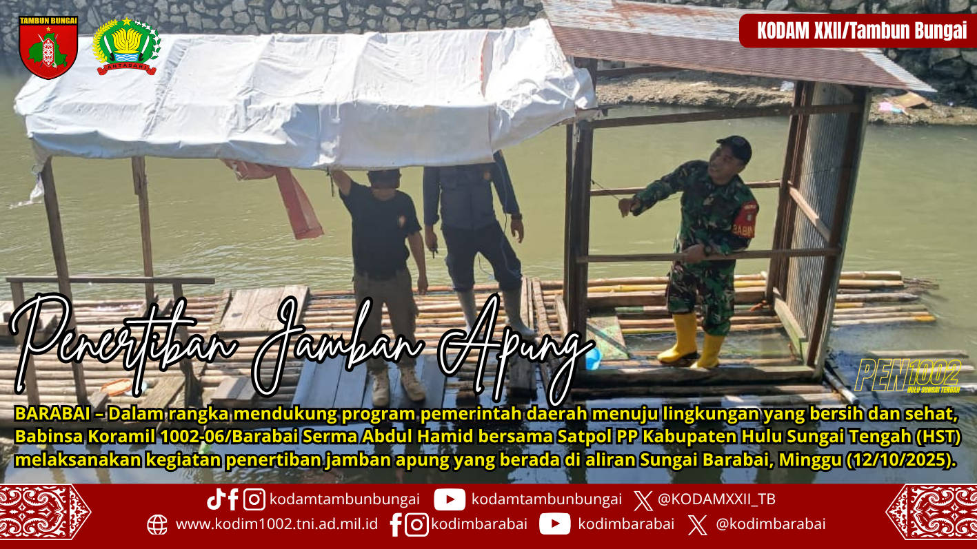 BARABAI – Dalam rangka mendukung program pemerintah daerah menuju lingkungan yang bersih dan sehat, Babinsa Koramil 1002-06/Barabai Serma Abdul Hamid bersama Satpol PP Kabupaten Hulu Sungai Tengah (HST) melaksanakan kegiatan penertiban jamban apung yang berada di aliran Sungai Barabai, Minggu (12/10/2025).