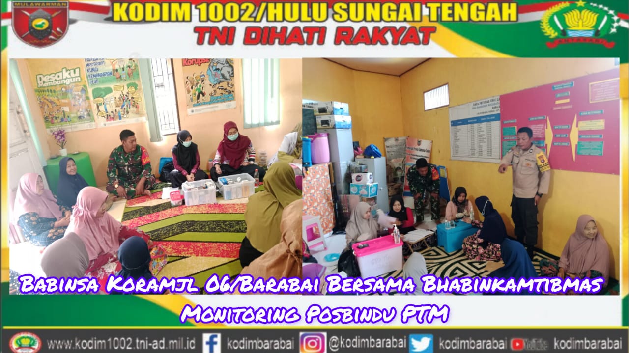 BARABAI-Kompak Babinsa Koramil 1002-06/Barabai Koptu Hartono dan Bhabinkamtibmas melaksanakan pemantauan kegiatan Posbindu PTM di desa Mandingin Kecamatan Barabai Kabupaten Hulu Sungai Tengah.Sabtu (14/10)