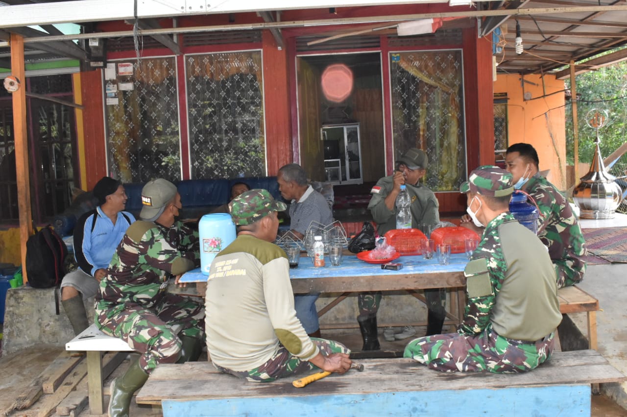 HULU SUNGAI TENGAH-Pererat silaturahmi dengan cara Komunikasi Sosial (Komsos) dilakukan Satgas TMMD Ke-112 Kodim 1002/Hulu Sungai Tengah (HST) disela – sela pengerjaan Rumah Tidak Layak Huni (RTLH) milik Rusdi.