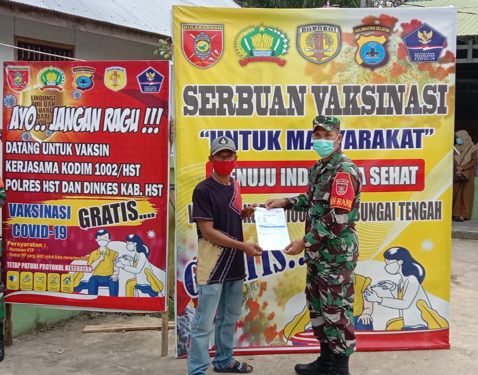 Kegiatan serbuan vaksinasi ini kolaborasi bertempat Koramil 1002-01/Batang Alai Selatan dengan Dinas Kesehatan Kabupaten HST melalui Puskesmas Birayang dan Puskesmas Kubur Jawa serta Polkes 06.09.15/Barabai.