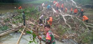 BARABAI-Bersama warga Desa Pajukungan Kecamatan Barabai dan warga Durian Gantang Kecamatan Labuan Amas Selatan, anggota Koramil 1002-06/Barabai melaksanakan gotong royong evakuasi/pembersihan pohon tumbang yang menghalangi aliran sungai Barabai. Rabu (22/07/2021).