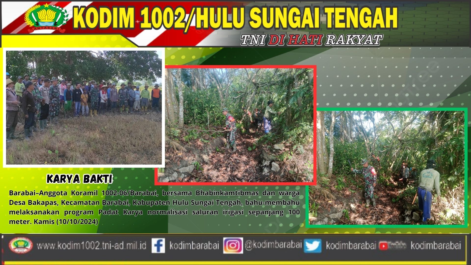 Barabai–Anggota Koramil 1002-06/Barabai, bersama Bhabinkamtibmas dan warga Desa Bakapas, Kecamatan Barabai, Kabupaten Hulu Sungai Tengah, bahu-membahu melaksanakan program Padat Karya normalisasi saluran irigasi sepanjang 100 meter. Kamis (10/10/2024)