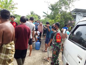 Sementara itu Serda M.Zulkifli menyampaikan penstribusian air bersih ini menggunakan mobil tanki air dari PDAM kemudian ditampung di tandon dan selanjutnya warga antri menggunakan dirigen ataupun ember.