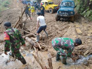 BARABAI-Kompak dan penuh semangat Babinsa Koramil 1002-07/Pagat Kodim 1002//Barabai Serda Embran Hartono dan Serda Sapto buka jalan untuk pendorongan logistik ke desa Datar Ajab.Sabtu (30/01).