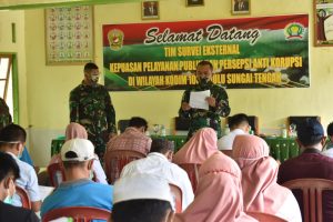 Setibanya di Makodim 1002/HST sekira pukul 09.00 wita di Kodim 1002/HST Jl. Telaga Padawangan Barabai dilanjutkan dengan kegiatan Survei Eksternal Kepuasan Pelayanan Publik dan Persepsi Anti Korupsi TNI AD TA. 2021 di lokasi TMMD ke-103 tahun 2020 yang telah dilaksanakan oleh Kodim 1002/HST.