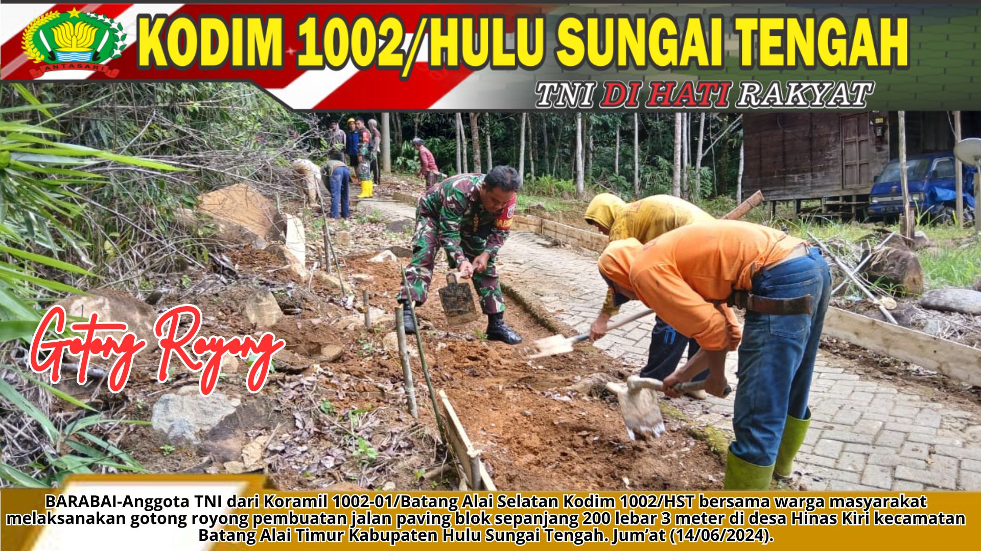 BARABAI-Anggota TNI dari Koramil 1002-01/Batang Alai Selatan Kodim 1002/HST bersama warga masyarakat melaksanakan gotong royong pembuatan jalan paving blok sepanjang 200 lebar 3 meter di desa Hinas Kiri kecamatan Batang Alai Timur Kabupaten Hulu Sungai Tengah. Jum’at (14/06/2024).