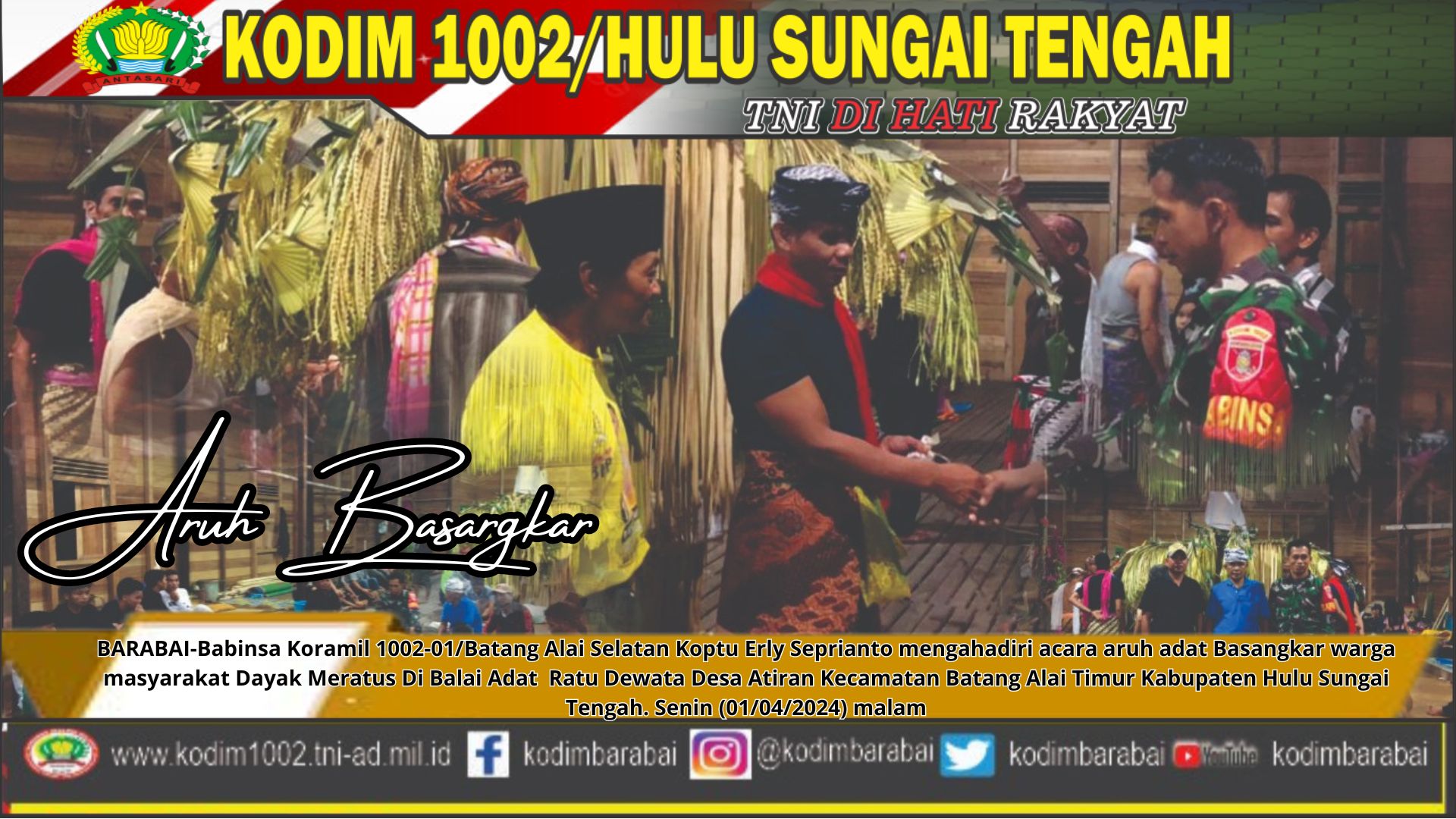 BARABAI-Babinsa Koramil 1002-01/Batang Alai Selatan Koptu Erly Seprianto mengahadiri acara aruh adat Basangkar warga masyarakat Dayak Meratus Di Balai Adat Ratu Dewata Desa Atiran Kecamatan Batang Alai Timur Kabupaten Hulu Sungai Tengah. Senin (01/04/2024) malam