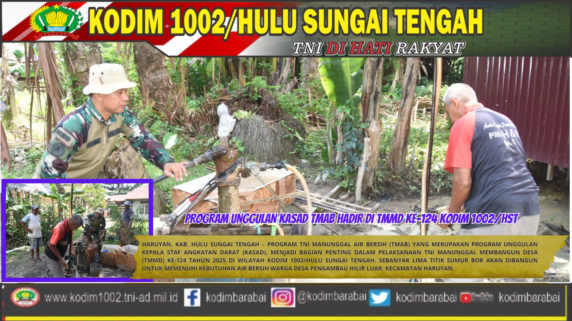HARUYAN, KAB. HULU SUNGAI TENGAH – Program TNI Manunggal Air Bersih (TMAB) yang merupakan program unggulan Kepala Staf Angkatan Darat (KASAD), menjadi bagian penting dalam pelaksanaan TNI Manunggal Membangun Desa (TMMD) ke-124 tahun 2025 di wilayah Kodim 1002/Hulu Sungai Tengah. Sebanyak lima titik sumur bor akan dibangun untuk memenuhi kebutuhan air bersih warga Desa Pengambau Hilir Luar, Kecamatan Haruyan.