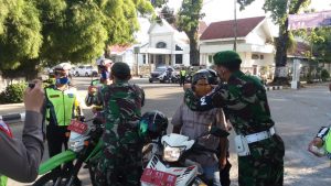 Pembagian masker gratis anggota TNI dari Kodim 1002/Barabai dan anggota Polres HST di jalan Jalan Brigjed H.HasanĀ  Baseri Barabai, Rabu, (15/4).