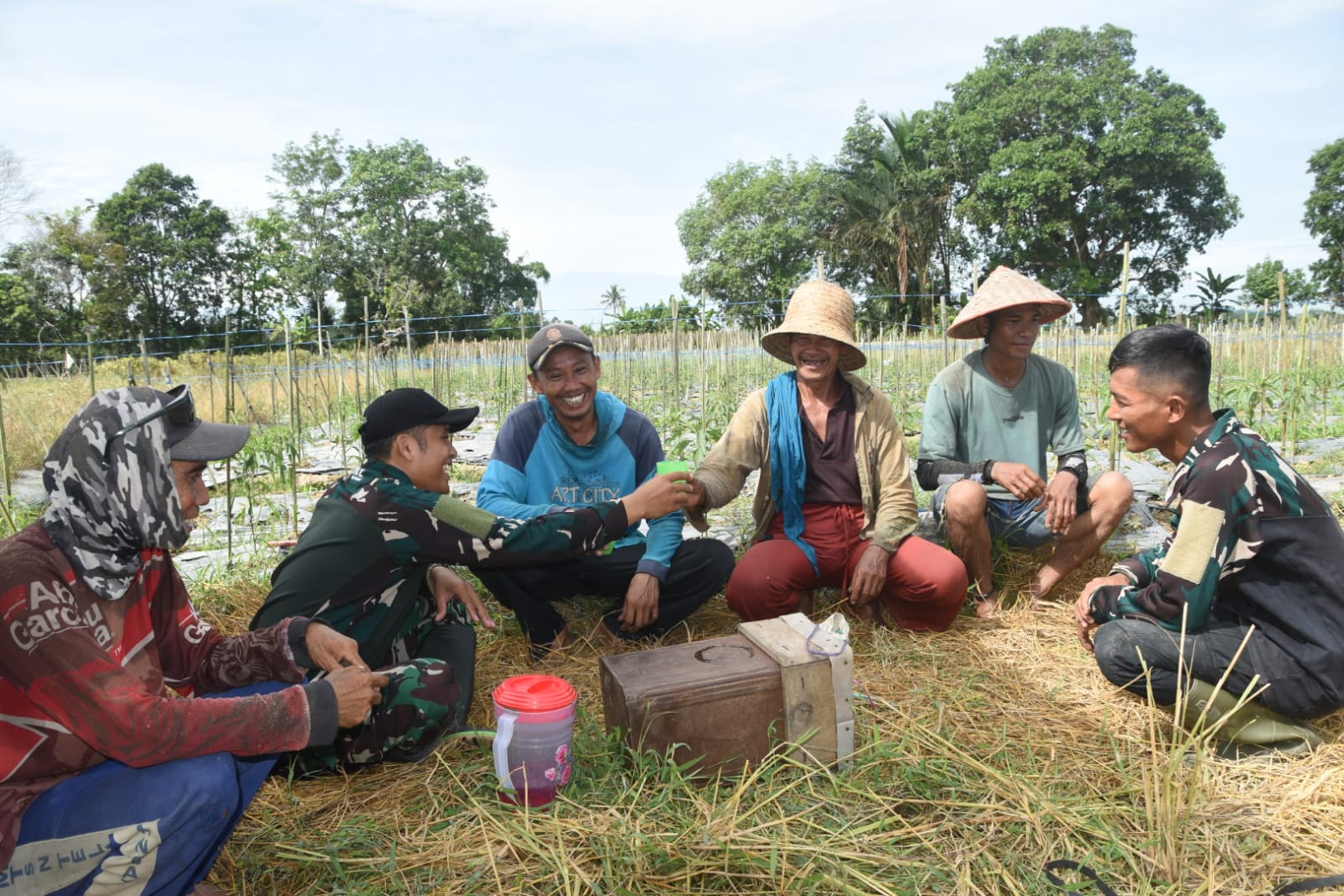 Momen kebersamaan ini menciptakan suasana yang hangat dan penuh kekeluargaan. Di tengah obrolan santai, salah seorang anggota Satgas TMMD bahkan terlihat memberikan segelas teh kepada warga, sebagai bentuk keakraban dan kepedulian.