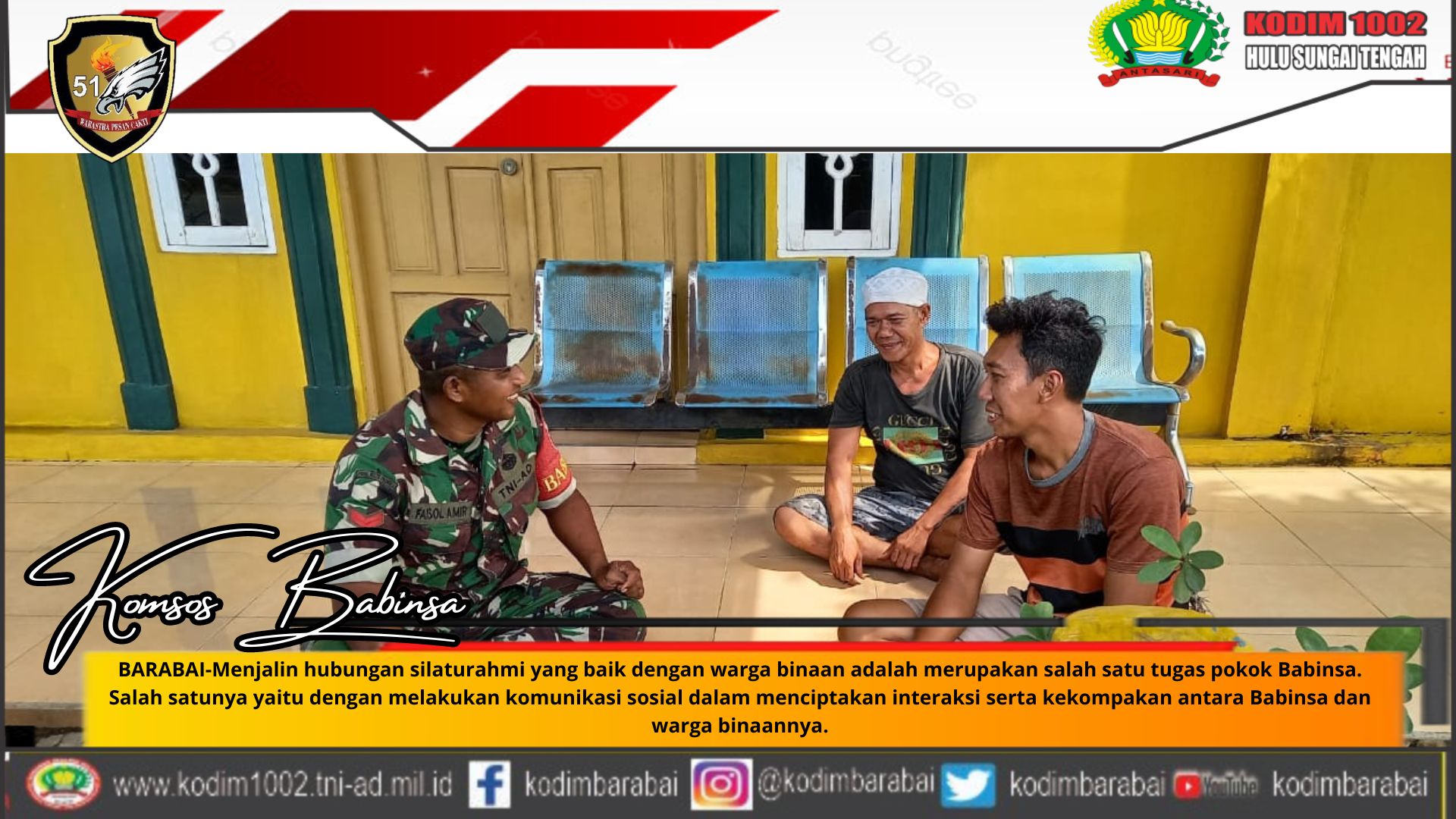 BARABAI-Menjalin hubungan silaturahmi yang baik dengan warga binaan adalah merupakan salah satu tugas pokok Babinsa. Salah satunya yaitu dengan melakukan komunikasi sosial dalam menciptakan interaksi serta kekompakan antara Babinsa dan warga binaannya.
