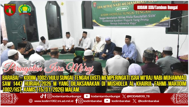 BARABAI – Kodim 1002/Hulu Sungai Tengah (HST) memperingati Isra Mi’raj Nabi Muhammad SAW 1447 Hijriah/2026 M yang dilaksanakan di Musholla Al Khairul Fahmi Makodim 1002/HST, Kamis (15/01/2026) malam.