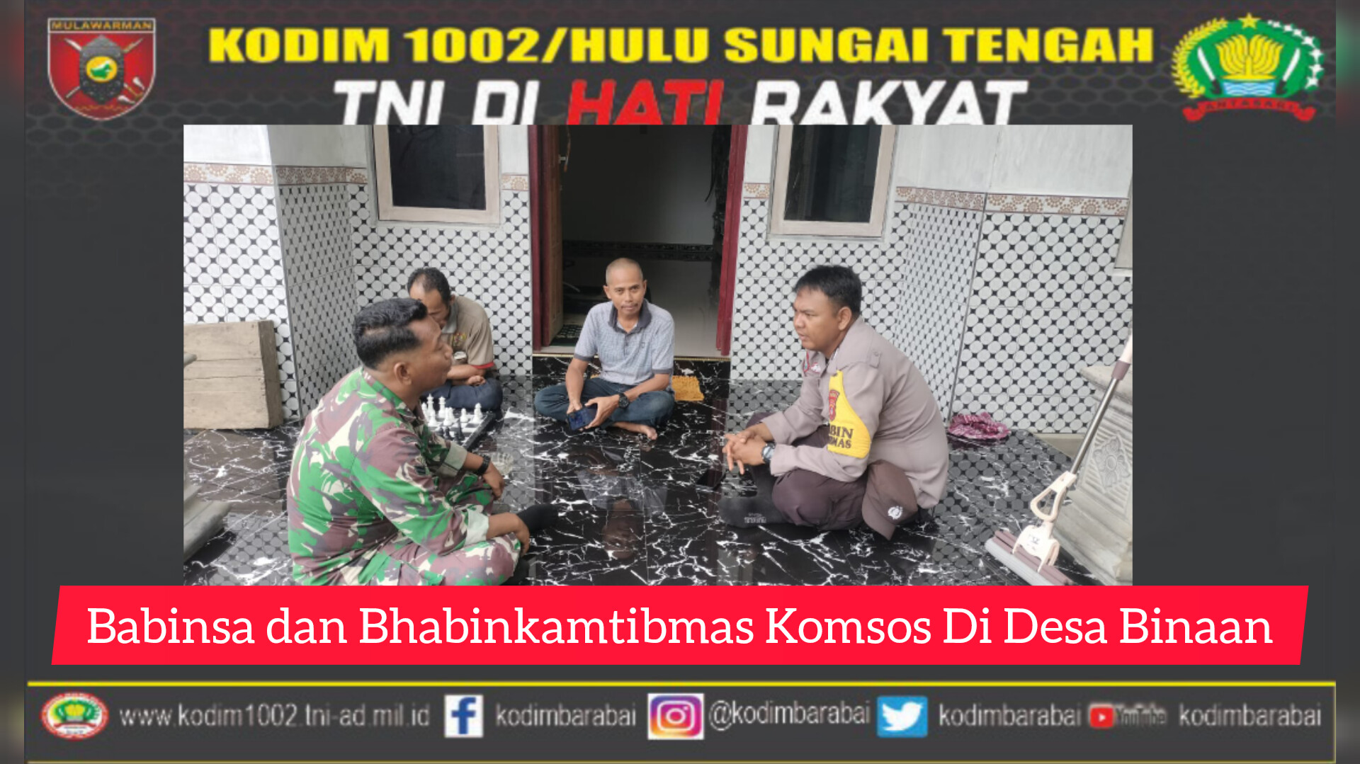 BARABAI-Komunikasi Sosial (Komsos) adalah salah satu media Babinsa dan Bhabinkamtibmas untuk mengenal warga binaannya lebih dekat lagi dan sebagai sarana silaturahmi agar lebih dekat dengan warga masyarakat.