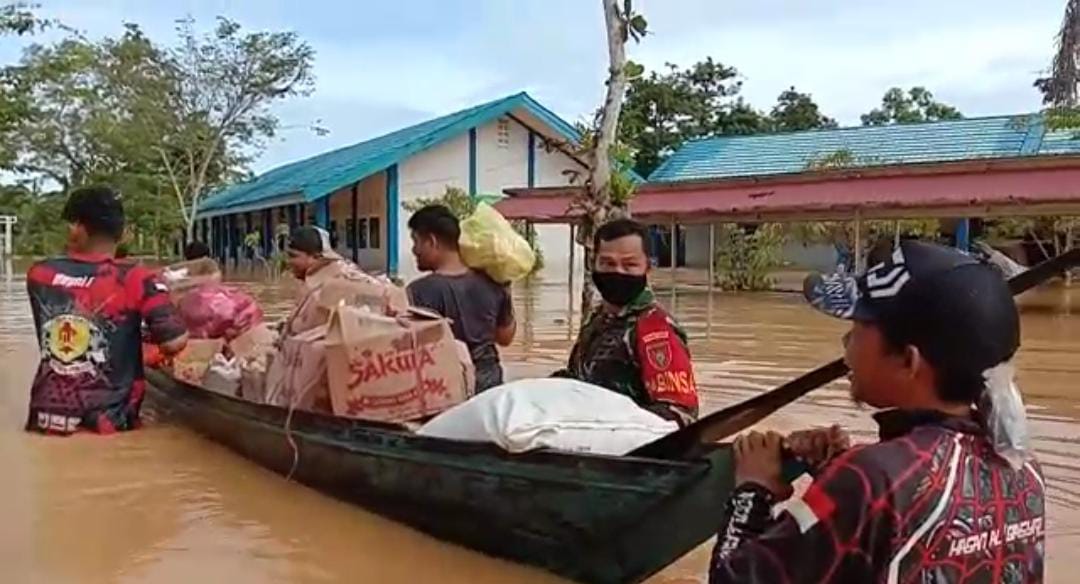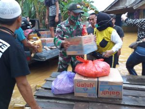 Dengan memaksimalkan anggota Babinsa dilapangan, anggota TNI dan relawan berjibaku dengan air banjir untuk mengantar logistik.”ucapnya.