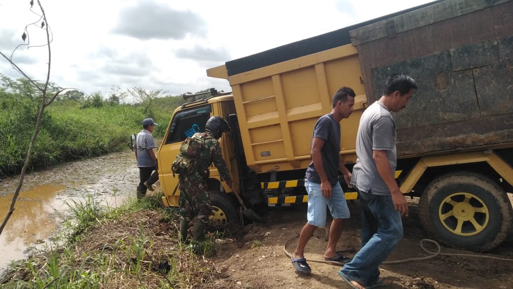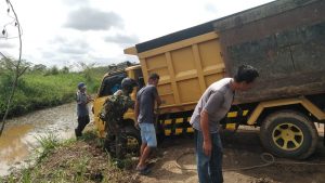 Dengan sigap Babinsa dan para sopir armada dump truck lainnya membantu mengeluarkan truk tersebut dari parit.