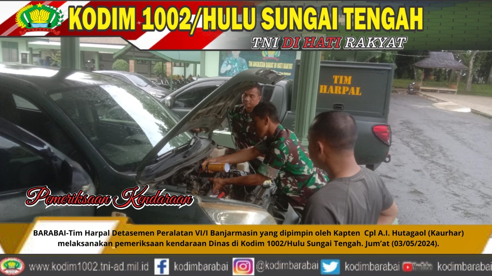 BARABAI-Tim Harpal Detasemen Peralatan VI/I Banjarmasin yang dipimpin oleh Kapten Cpl A.I. Hutagaol (Kaurhar) melaksanakan pemeriksaan kendaraan Dinas di Kodim 1002/Hulu Sungai Tengah. Jum’at (03/05/2024).