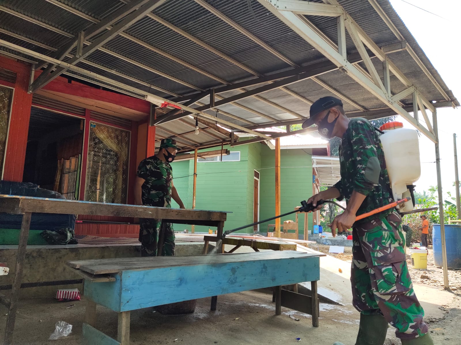 Minimalisir Penyebaran Corona, Babinsa Kasarangan Semprotkan Disinfektan Di Lokasi TMMD