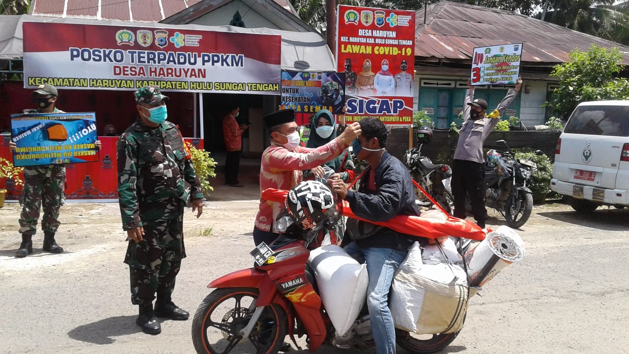 BARABAI-Forum koordinasi pimpinan kecamatan Haruyan melaksanakan kunjungan ke Posko PPKM Mikro Desa Haruyan dilanjutkan operasi yustisi penegakkan disiplin protokol kesehatan Covid-19 dan pembagian masker.Kamis (04/03).