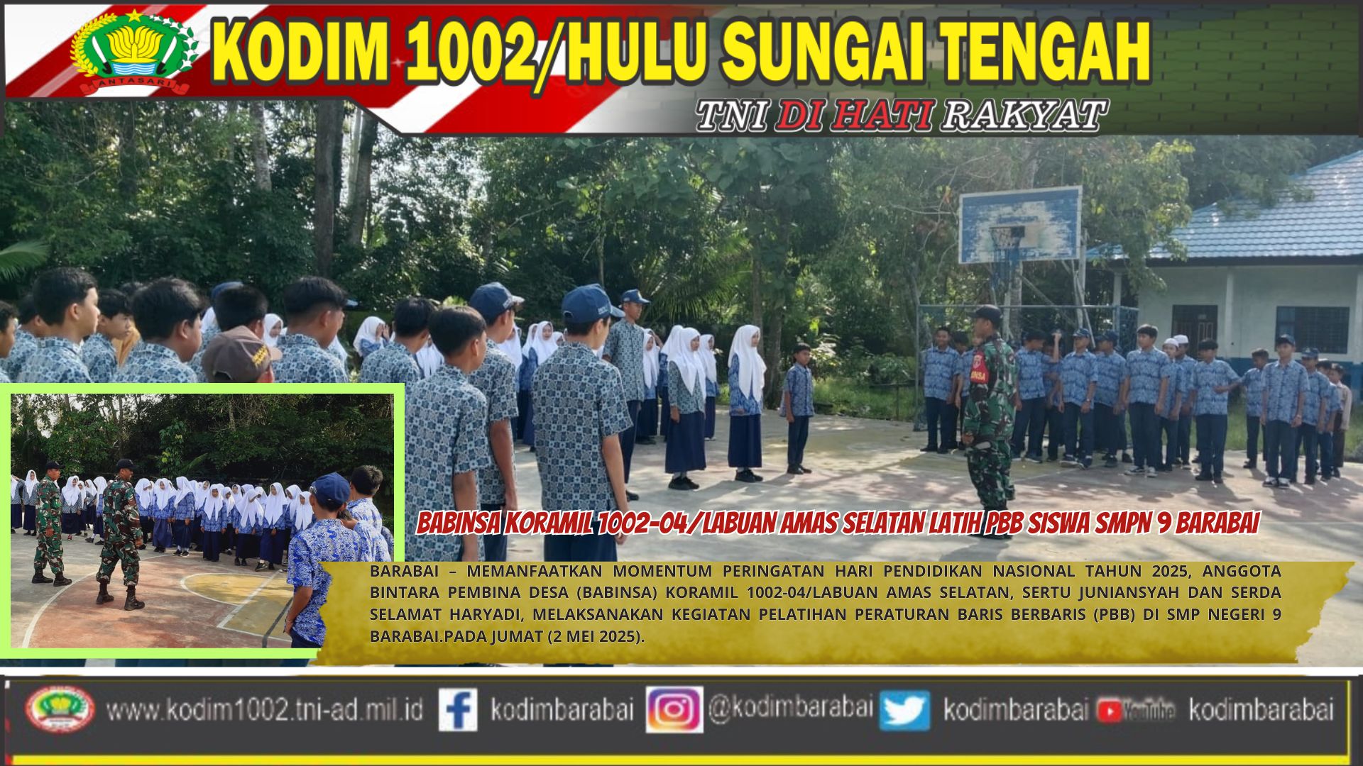 BARABAI – Memanfaatkan momentum peringatan Hari Pendidikan Nasional tahun 2025, anggota Bintara Pembina Desa (Babinsa) Koramil 1002-04/Labuan Amas Selatan, Sertu Juniansyah dan Serda Selamat Haryadi, melaksanakan kegiatan pelatihan Peraturan Baris Berbaris (PBB) di SMP Negeri 9 Barabai.pada Jumat (02 Mei 2025).