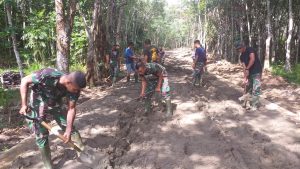 TNI-Rakyat dengan penuh semangat mengerjakan pembuatan pondasi kiri kanan jalan sepanjang 1.928 meter, sementara anggota satgas yang lain merapikan jalan yang berlubang dan ditutup kembali dengan sertu.