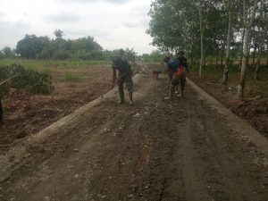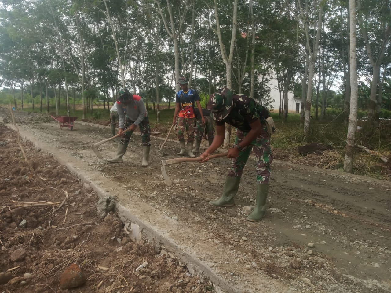 HULU SUNGAI TENGAH- Kegiatan TNI Manunggal Membangun Desa (TMMD) ke-112 Kodim 1002/Hulu Sungai Tengah, di Desa Rantau Keminting, Kecamatan Labuan Amas Utara, meski panas terik matahari yang menyengat bahkan hujan turun deras, Satgas TMMD tetap semangat melaksanakan pekerjaan fisik di lokasi sasaran tersebut.