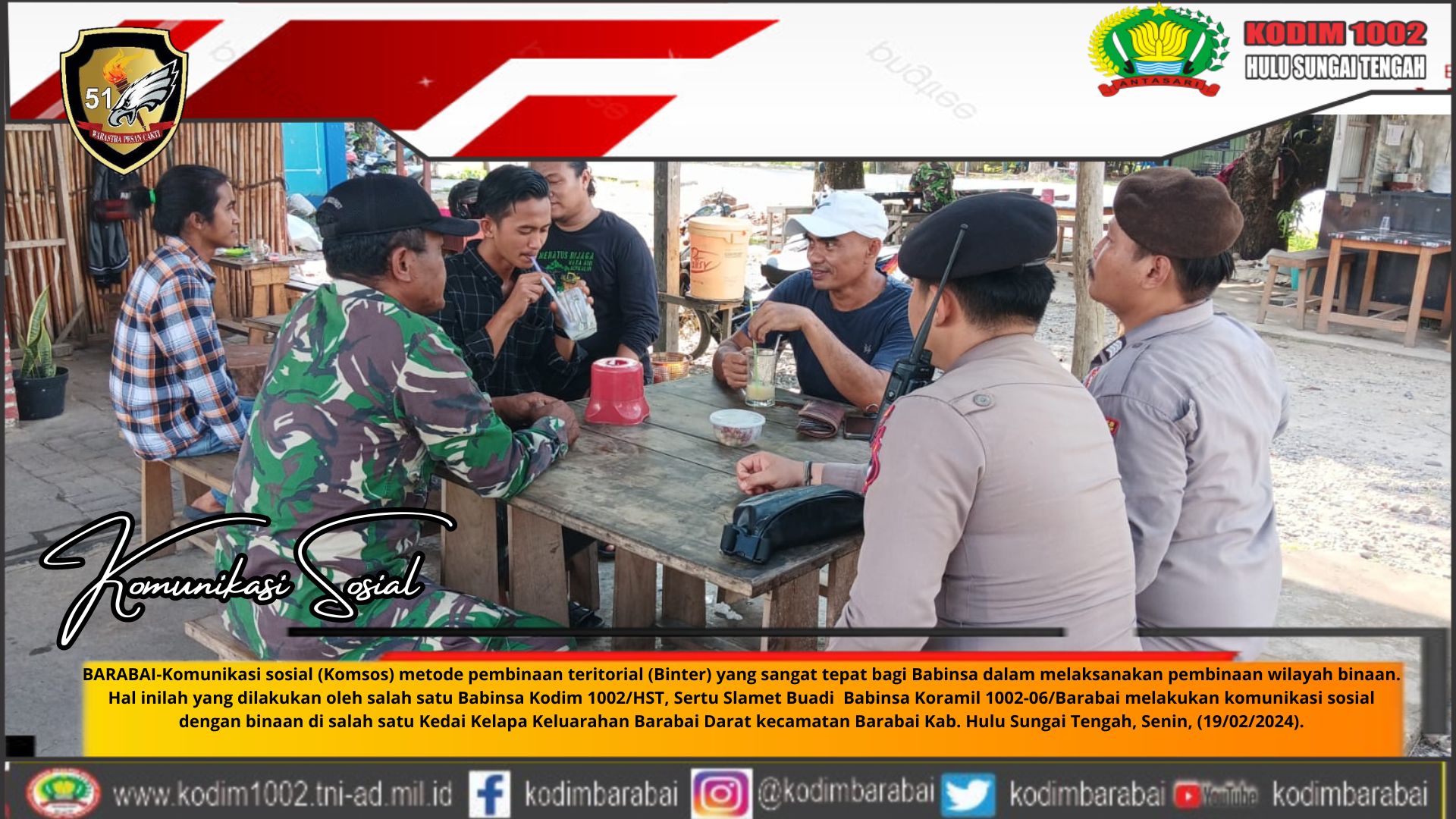 Hal inilah yang dilakukan oleh salah satu Babinsa Kodim 1002/HST, Sertu Slamet Buadi Babinsa Koramil 1002-06/Barabai melakukan komunikasi sosial dengan binaan di salah satu Kedai Kelapa Keluarahan Barabai Darat kecamatan Barabai Kab. Hulu Sungai Tengah, Senin, (19/02/2024).