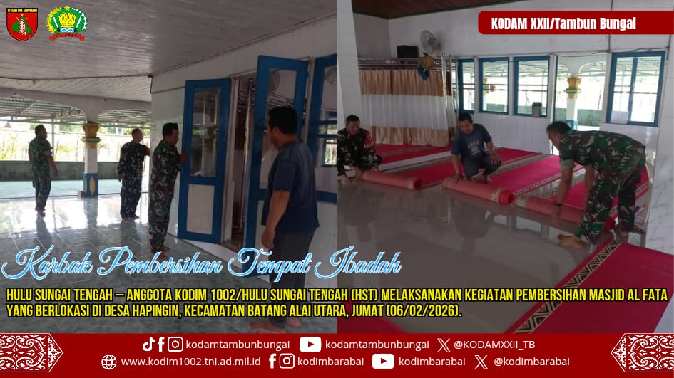 HULU SUNGAI TENGAH – Anggota Kodim 1002/Hulu Sungai Tengah (HST) melaksanakan kegiatan pembersihan Masjid Al Fata yang berlokasi di Desa Hapingin, Kecamatan Batang Alai Utara, Jumat (06/02/2026).