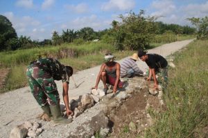HULU SUNGAI TENGAH-Bukan hanya pada program TMMD ke-112 Kodim 1002/Hulu Sungai Tengah (Hst) saja, Satgas TMMD Kodim HST, pedulikan pondasi batas kanan kiri jalan yang sudah rusak untuk diperbaiki.
