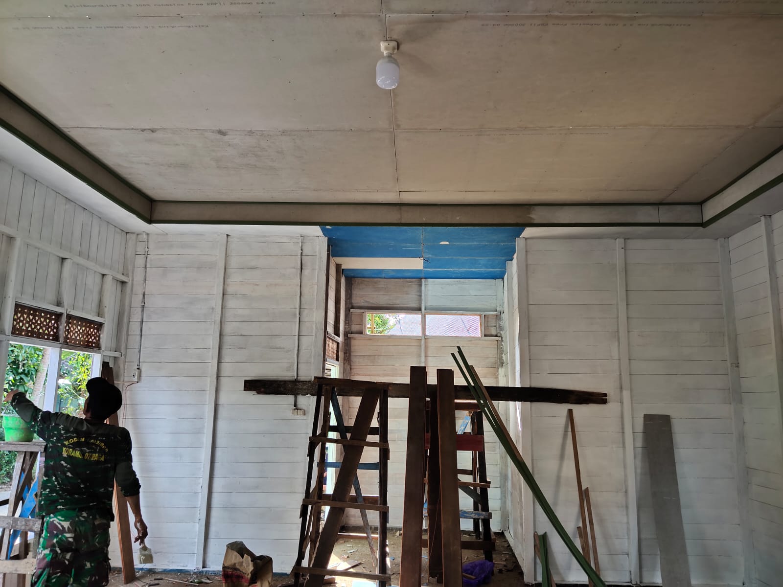 “Berkat bantuan masyarakat yang bersama – sama memaksimalkan tenaganya, akhirnya tahap pemasangan plafon selesai,”katanya
