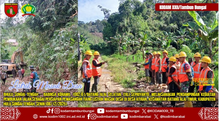 Hulu Sungai Tengah – Babinsa Koramil 1002-01/Batang Alai Selatan, Erli Sepriyanto, melaksanakan pendampingan kegiatan pembukaan jalan sebagai persiapan pemasangan tiang listrik masuk desa di Desa Atiran, Kecamatan Batang Alai Timur, Kabupaten Hulu Sungai Tengah, Senin (08/12/2025). Jalur listrik tersebut rencananya akan menghubungkan Desa Atiran menuju Desa Batu Perahu, sehingga manfaat penerangan dapat dirasakan oleh dua desa sekaligus.