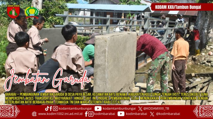 BARABAI – Pembangunan Jembatan Garuda di Desa Paya Besar, Kecamatan Batu Benawa, Kabupaten Hulu Sungai Tengah (HST), terus dikebut guna mempercepat akses transportasi masyarakat. Hingga saat ini, progres pembangunan telah menunjukkan perkembangan signifikan dengan keterlibatan aktif berbagai pihak, termasuk TNI dan warga setempat.Rabu (22/4).