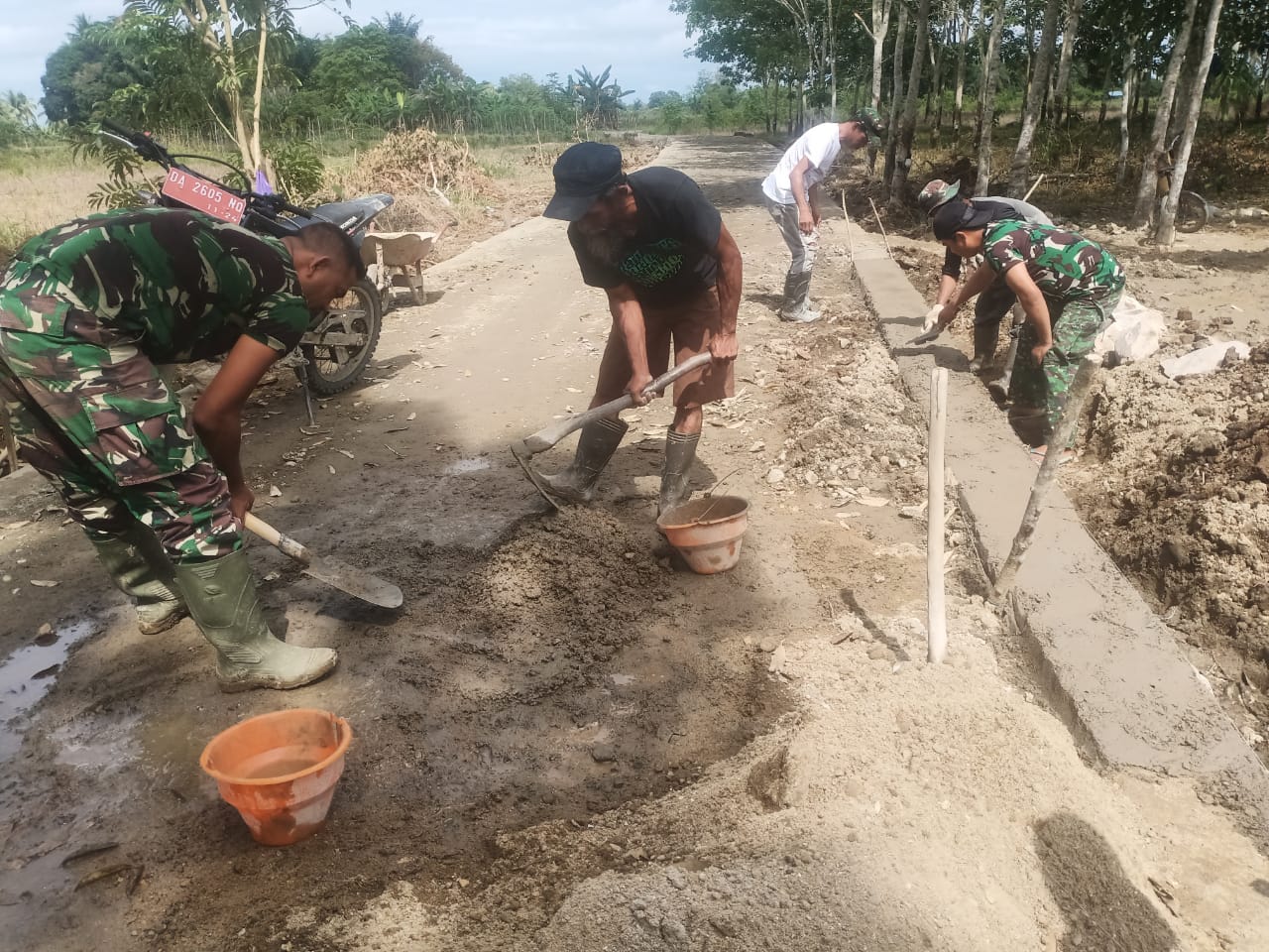 Diterangkan, Dan SSK TMMD Kodim HST, Kapten Inf Lilis Sutanto, Saat ini anggota Kodim 1002/HST yang tergabung dalam satgas TMMD di Kecamatan Labuan Amas Utara terlihat sedang membuat bahan campuran semen untuk melanjutkan pembuatan pondasi kanan dan kiri jalan.