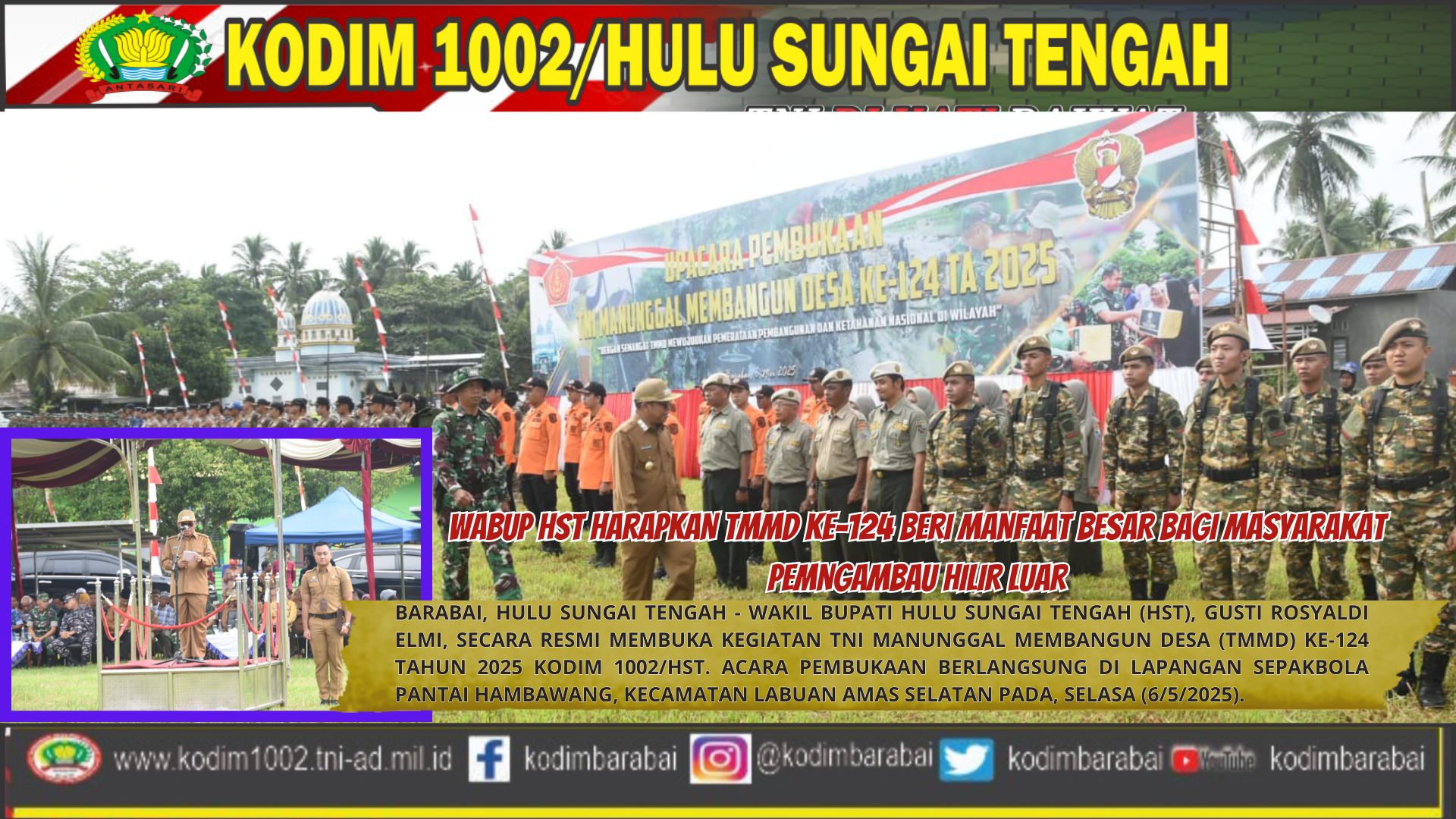 BARABAI, HULU SUNGAI TENGAH – Wakil Bupati Hulu Sungai Tengah (HST), Gusti Rosyaldi Elmi, secara resmi membuka kegiatan TNI Manunggal Membangun Desa (TMMD) ke-124 Tahun 2025 Kodim 1002/HST. Acara pembukaan berlangsung di Lapangan Sepakbola Pantai Hambawang, Kecamatan Labuan Amas Selatan pada, Selasa (6/5/2025).