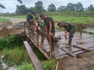 Salah satu sasaran fisik berupa perbaikan jembatan dengan panjang 8 meter kelebaran 3,5 meter sudah mencapai 85 persen,” terang Serka Yatimin (anggota Satgas TMMD ke-122 dari Den Zipur 8/MG) selaku koordinator pekerjaan perbaikan jembatan,”Senin (27/09/2021).