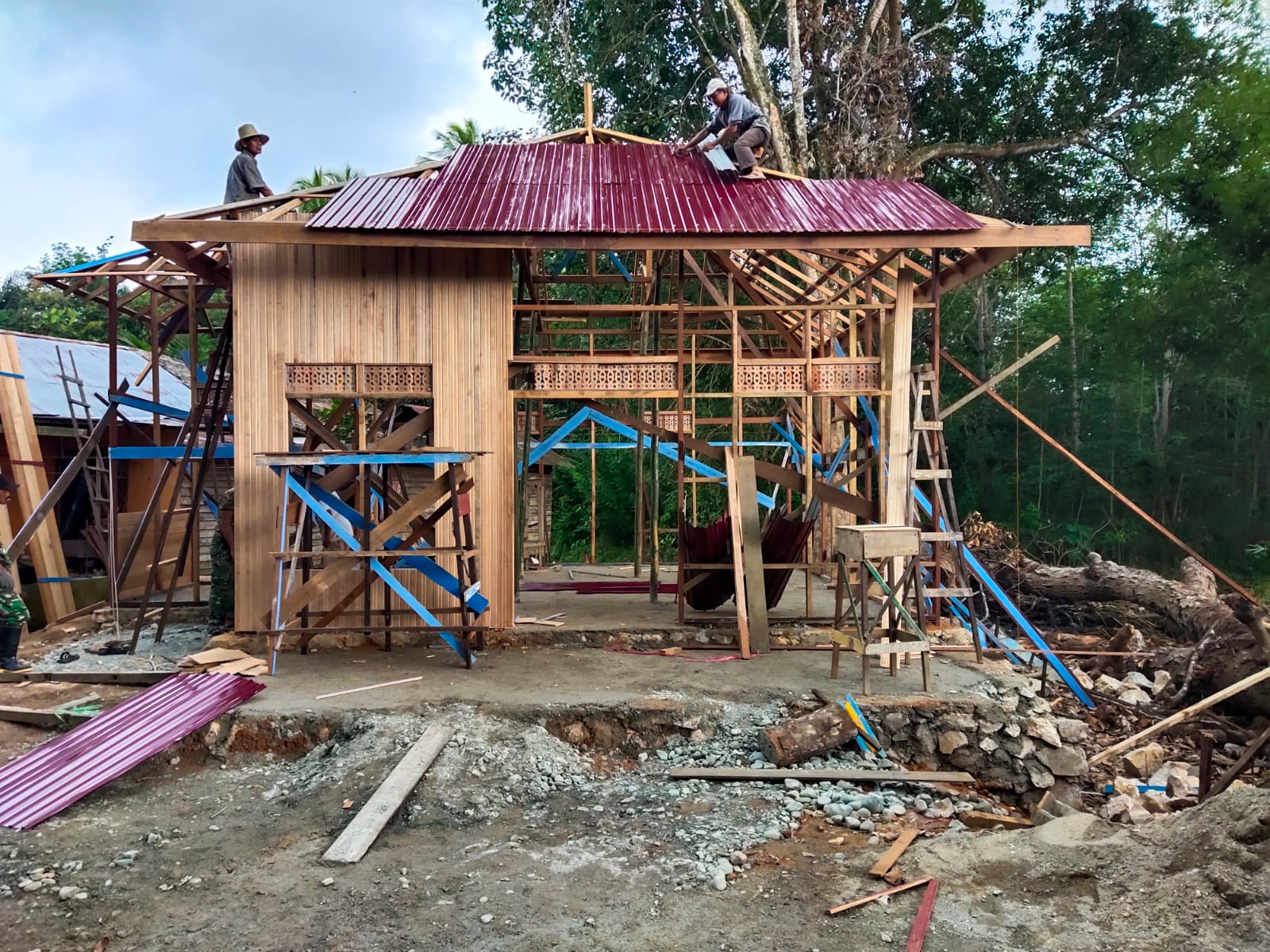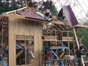 Terlihat di lokasi, satu per satu Satgas TMMD Kodim HST mulai memasang atap seng Musholla Noor Iman.