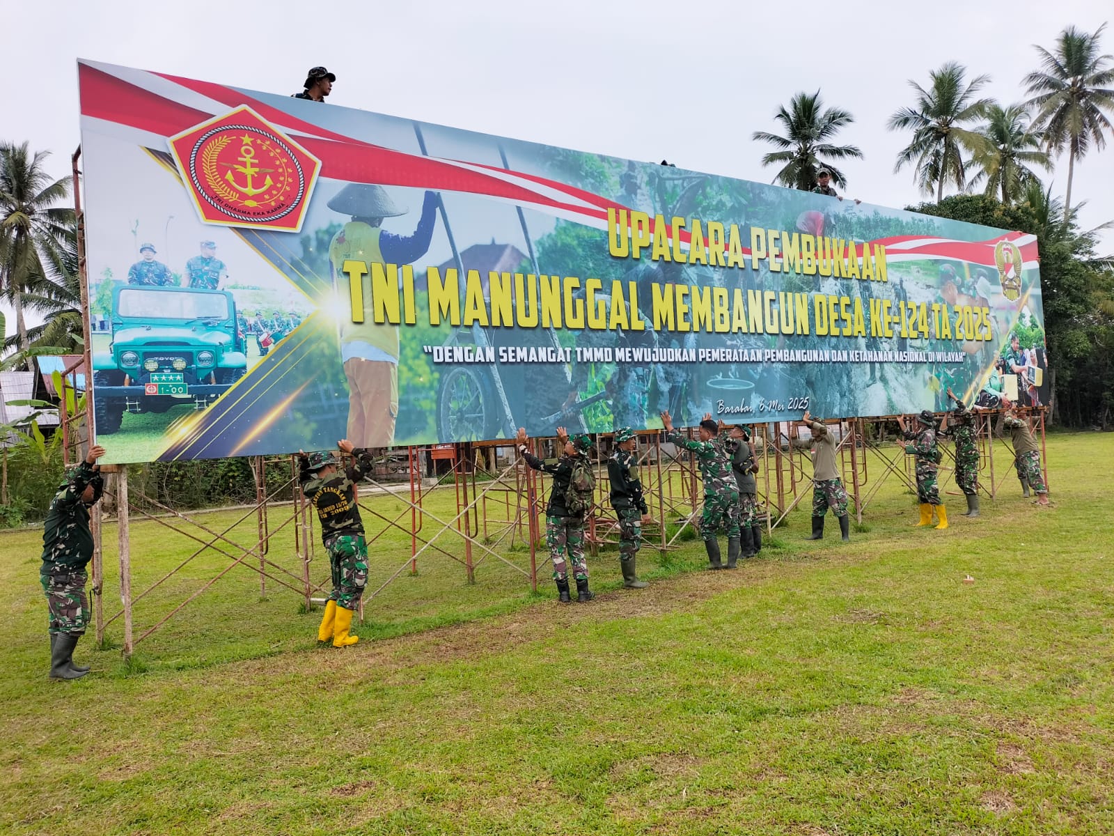 Pemasangan baliho ini menjadi salah satu indikator kesiapan pelaksanaan upacara penutupan TMMD ke-124 Kodim 1002/HST yang semakin dekat.(pen1002hst).