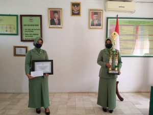 BARABAI – Ketua Persit Kartika Cabang XXV Kodim 1002 Koorcab Rem 101 PD VI/Mulawarman Ny.Muh.Ishak HB menyerahkan piala dan penghargaan lomba HUT ke-74 Pesit tahun 2020.