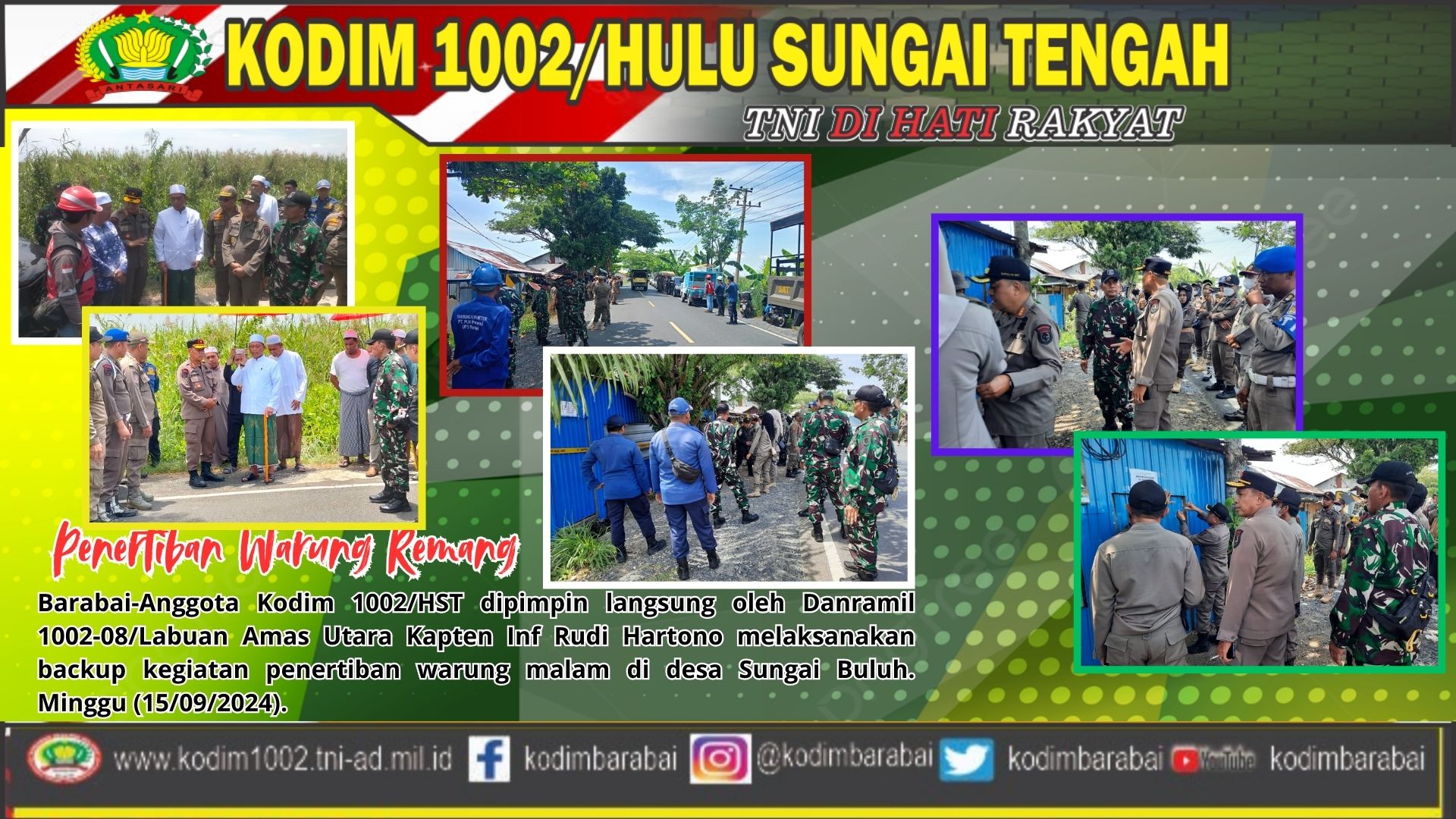 Barabai-Anggota Kodim 1002/HST dipimpin langsung oleh Danramil 1002-08/Labuan Amas Utara Kapten Inf Rudi Hartono melaksanakan backup kegiatan penertiban warung malam di desa Sungai Buluh. Minggu (15/09/2024).