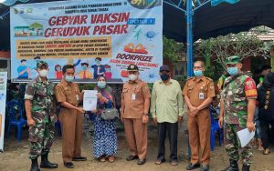 Dengan berkeliling pasar, Danramil, Camat Dan Kapolsek secara bergantian mengimbau pengunjung pasar untuk ikut vaksin.